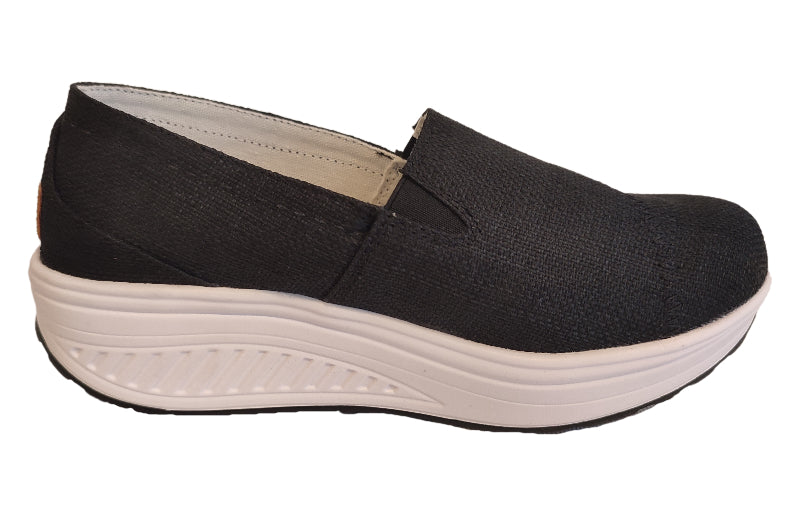 Cómoda zapatilla con plataforma y fresca capellada de lona, combinable con innumerables outfits y para todas las temporadas. Liviana y fácil de ajustar con plantilla interior de cuero que permite frescura y comodidad al andar.